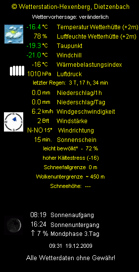 Hinweis: Alle Wetterdaten werden automatisch generiert und sind ohne Gewähr! Es besteht kein Anspruch auf eine regelmäßige Aktualisierung! |